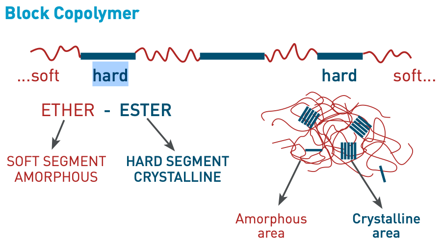 TPE-E یک الاستومر پلی استر ترموپلاستیک است. این یک کوپلیمر بلوک است که از یک بخش سخت (کریستالی) پلی استر و یک بخش نرم (آمورف) مبتنی بر PTMEG تشکیل شده است. این مقاومت و مقاومت شیمیایی را با استحکام و دوام در محدوده دمای گسترده ترکیب می کند.